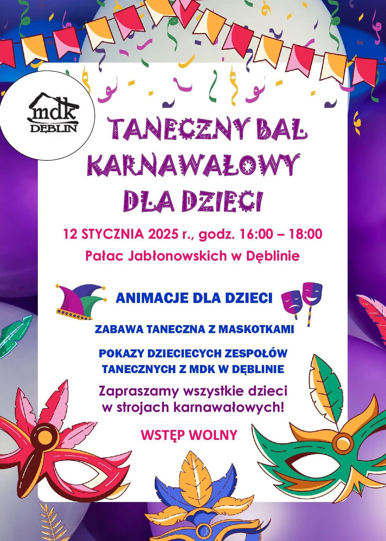 Wydarzenie odbędzie się w Pałacu Jabłonowskich w Dęblinie w niedzielę, 12 stycznia w godz. 16:00 – 18:00. Dzieci, będą miały okazję przywdziać karnawałowe stroje i dołączyć do wspólnej tanecznej zabawy z animatorami oraz tancerzami z lokalnych zespołów „Małej Rewii Tanecznej” i „Dębliniaków”.