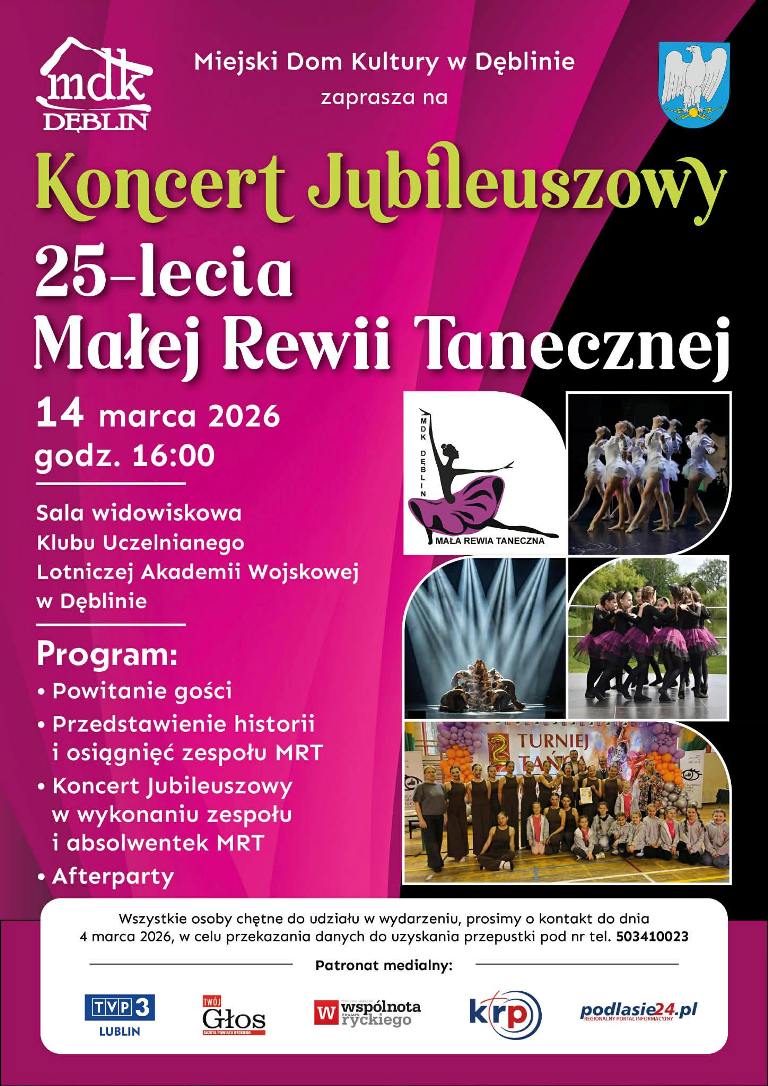 Mała Rewia Taneczna działająca przy Miejskim Domu Kultury w Dęblinie obchodzi w tym roku jubileusz 25-lecia swojej działalności. Z tej okazji 14 marca 2026 roku o godzinie 16:00 odbędzie się koncert jubileuszowy w sali widowiskowej Klubu Uczelnianego Lotniczej Akademii Wojskowej w Dęblinie.