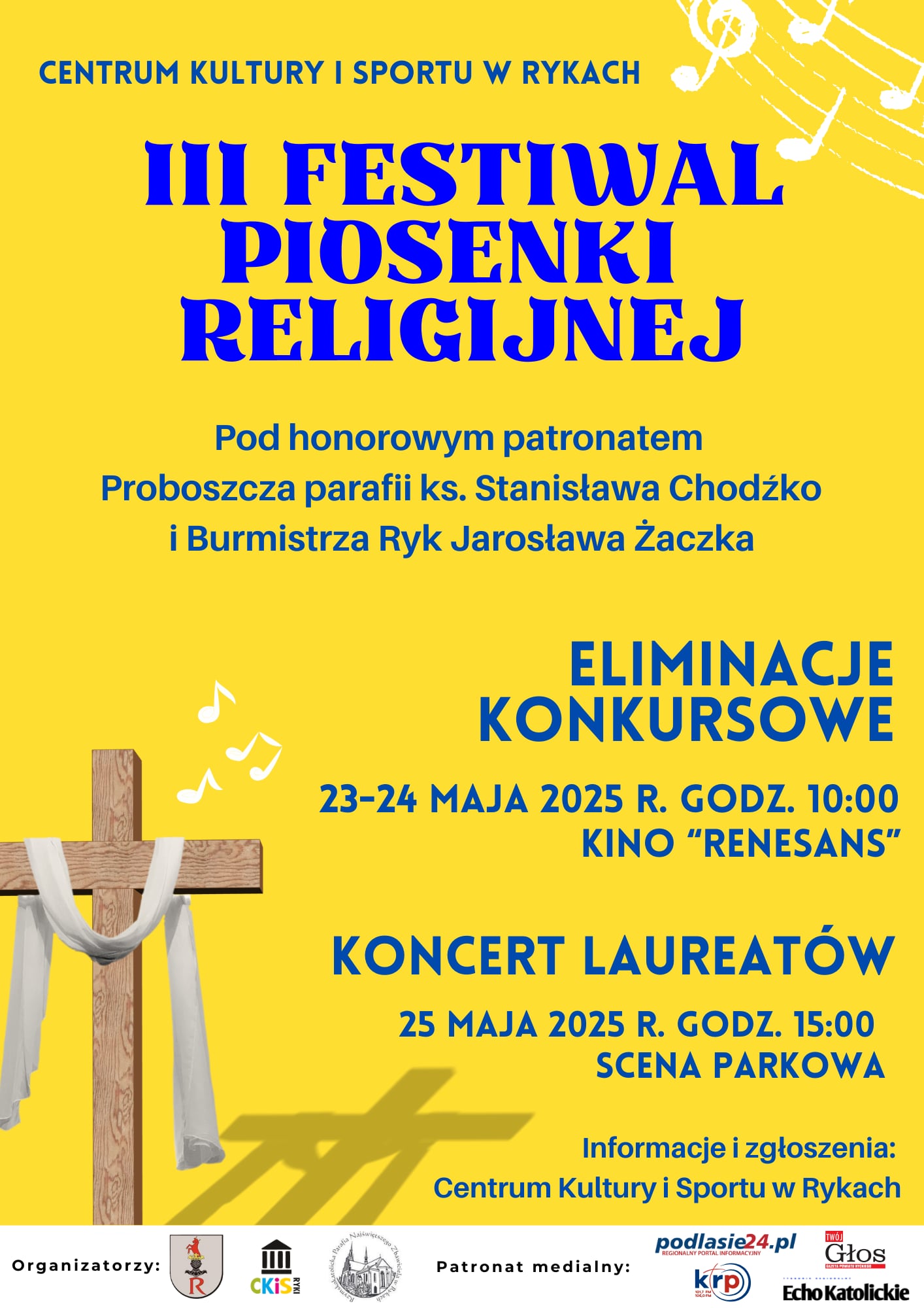 W dniach 23-25 maja w Rykach odbędzie się III Festiwal Piosenki Religijnej - wydarzenie organizowane pod honorowym patronatem Proboszcza parafii ks. Stanisława Chodźko oraz Burmistrza Ryk Jarosława Żaczka. Festiwal rozpocznie się od eliminacji konkursowych, które zaplanowano na 23 i 24 maja w Kinie "Renesans".