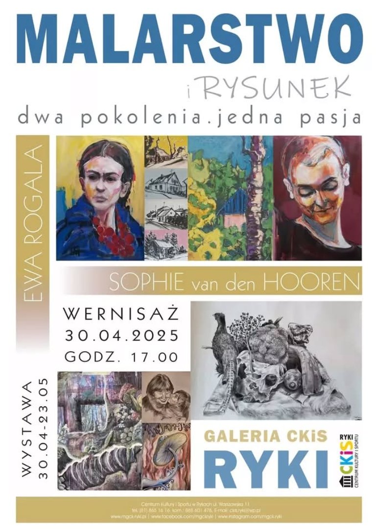 W Centrum Kultury i Sportu w Rykach zaprezentowana zostanie wystawa rysunku i malarstwa „Dwa Pokolenia, Jedna Pasja”. Ekspozycja ukazuje artystyczny dialog matki i córki – Ewy Rogali i Sophie van den Hooren, które, mimo różnic w swojej twórczości, łączy wspólna pasja do sztuki.