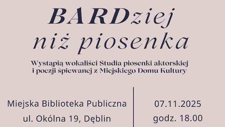 W piątkowy wieczór, 7 listopada o godzinie 18:00, w Miejskiej Bibliotece Publicznej w Dęblinie odbędzie się Zaduszkowy Koncert Wspomnień pod tytułem „BARDziej niż piosenka”.