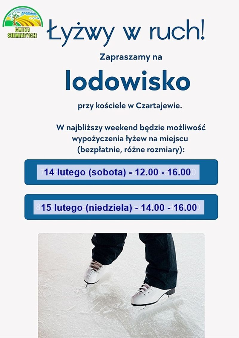 W dniach 14–15 lutego (sobota–niedziela), podobnie jak w poprzedni weekend, będzie możliwość bezpłatnego wypożyczenia łyżew.Dyżury na lodowisku zaplanowano w godzinach: