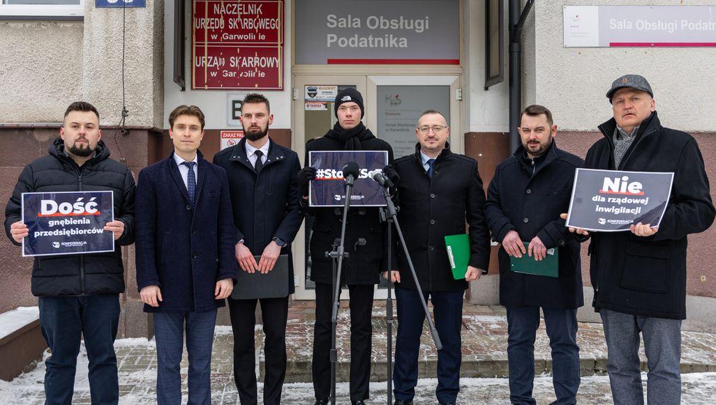 „Tykająca bomba podłożona pod polskich przedsiębiorców” – tak działacze Konfederacji określili Krajowy System e-Faktur podczas konferencji prasowej, która w piątek rano, 23 stycznia, odbyła się przed Urzędem Skarbowym w Garwolinie. Ich zdaniem rządowy projekt zamiast upraszczać prowadzenie firm, wprowadza chaos, zwiększa koszty i otwiera drogę do masowej inwigilacji działalności gospodarczej.