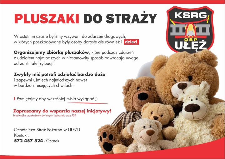Ochotnicza Straż Pożarna w Ułężu podjęła się realizacji nietypowej inicjatywy, a mianowicie „Pluszaki do straży”. Chętni mogą przekazać pluszaki strażakom, a na następnie misie mają trafić do dzieci.
