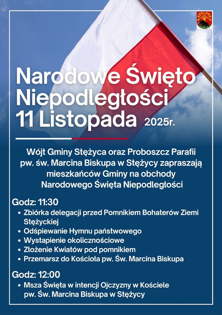 W Stężycy 11 listopada odbędą się uroczystości związane z Narodowym Świętem Niepodległości. Wydarzenie będzie okazją do wspólnego świętowania oraz uczczenia pamięci tych, którzy walczyli o wolną Polskę.