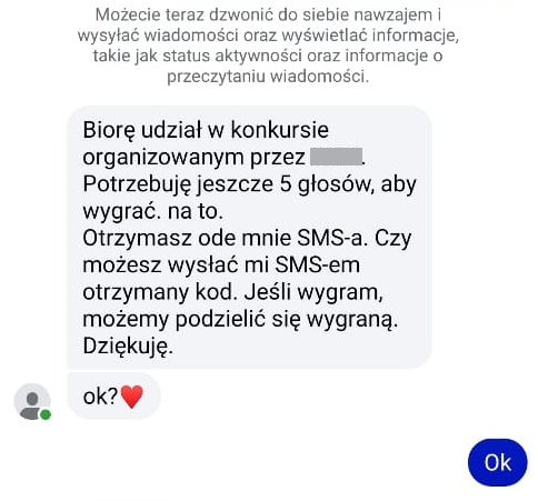 Do komendy zgłosiła się 41-latka, która poinformowała o tym, że padła ofiarą oszustwa. Jak relacjonowała, otrzymała wiadomość w komunikatorze od rzekomej znajomej, która poprosiła ją o podanie numeru telefonu, tłumacząc, że bierze udział w konkursie organizowanym przez znaną sieć sklepów. Według nadawczyni wiadomości, potrzebowała kilku osób, które pomogą jej w zdobyciu nagrody, którą planowała później się podzielić.Po chwili na telefon pokrzywdzonej przyszedł kod, który – zgodnie z prośbą „znajomej” – przesłała dalej. Następnie otrzymała kolejną wiadomość z prośbą o wygenerowanie kodów BLIK i ich autoryzację. Kiedy zauważyła, że z jej konta bankowego znikają pieniądze, fałszywa rozmówczyni uspokajała ją, twierdząc, że to „część procedury” i środki wkrótce wrócą na konto.