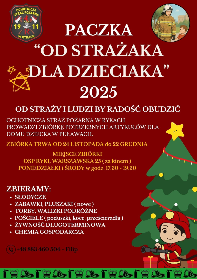 Ochotnicza Straż Pożarna w Rykach prowadzi kolejną edycję akcji charytatywnej „Paczka od Strażaka dla Dzieciaka”, której celem jest wsparcie podopiecznych Domu Dziecka w Puławach. Inicjatywa ma na celu zebranie niezbędnych artykułów, które przed świętami trafią do dzieci i młodzieży.