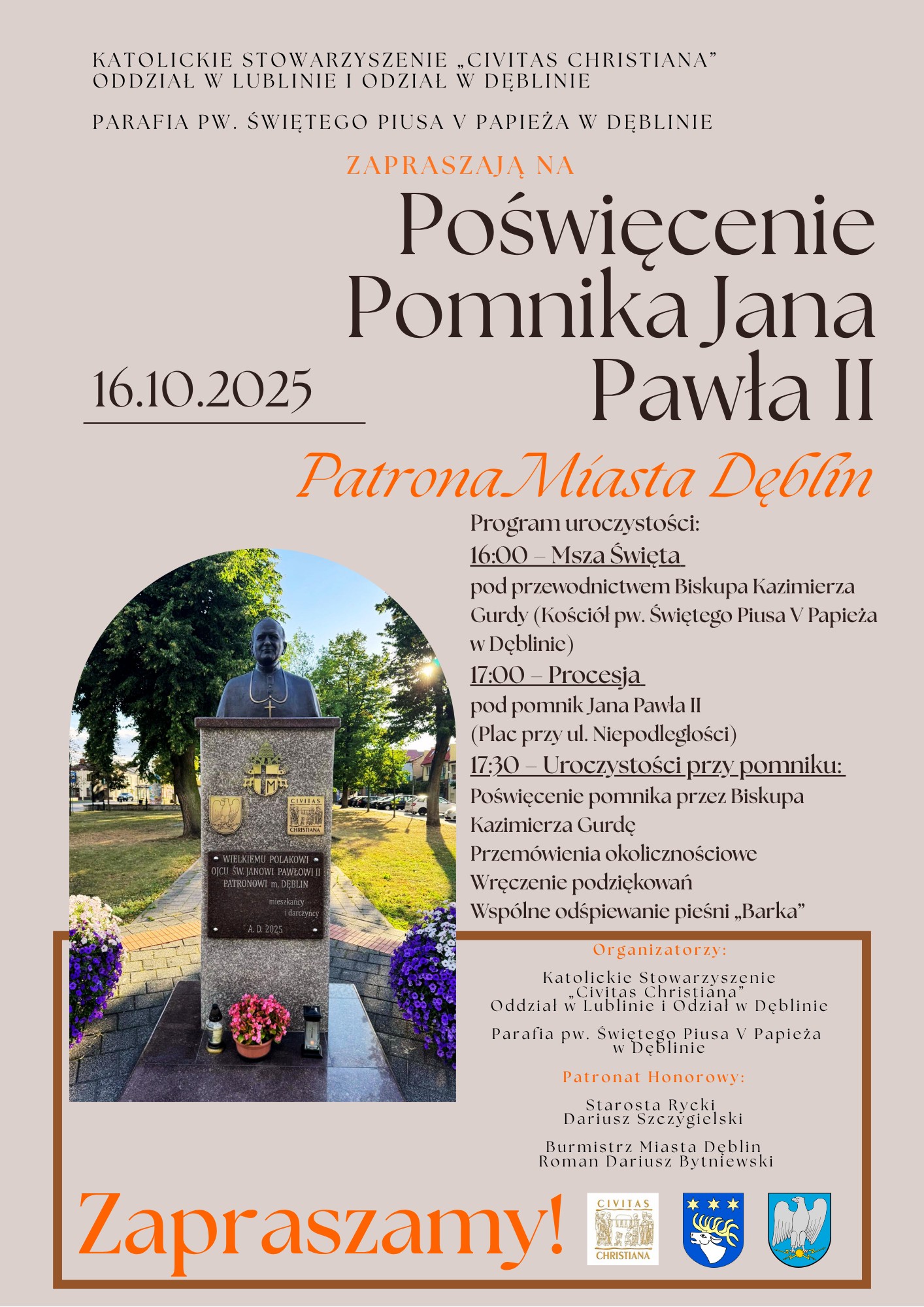 W rocznicę wyboru Karola Wojtyły na papieża mieszkańcy Dęblina oddadzą hołd św. Janowi Pawłowi II, uczestnicząc w uroczystości poświęcenia jego pomnika. Monument stanie w centralnym punkcie miasta – na placu przy ul. Niepodległości. W wydarzeniu, które odbędzie się w czwartek, 16 października, udział weźmie ordynariusz diecezji siedleckiej, biskup Kazimierz Gurda.