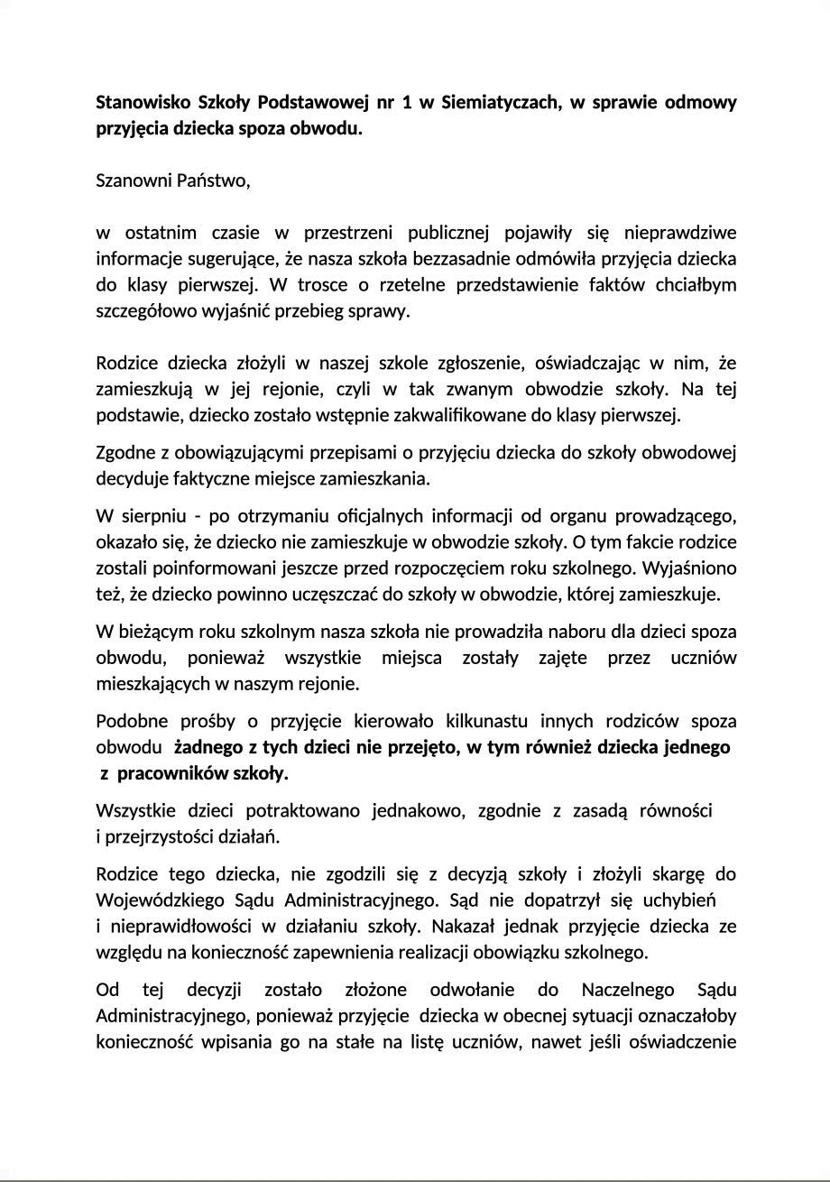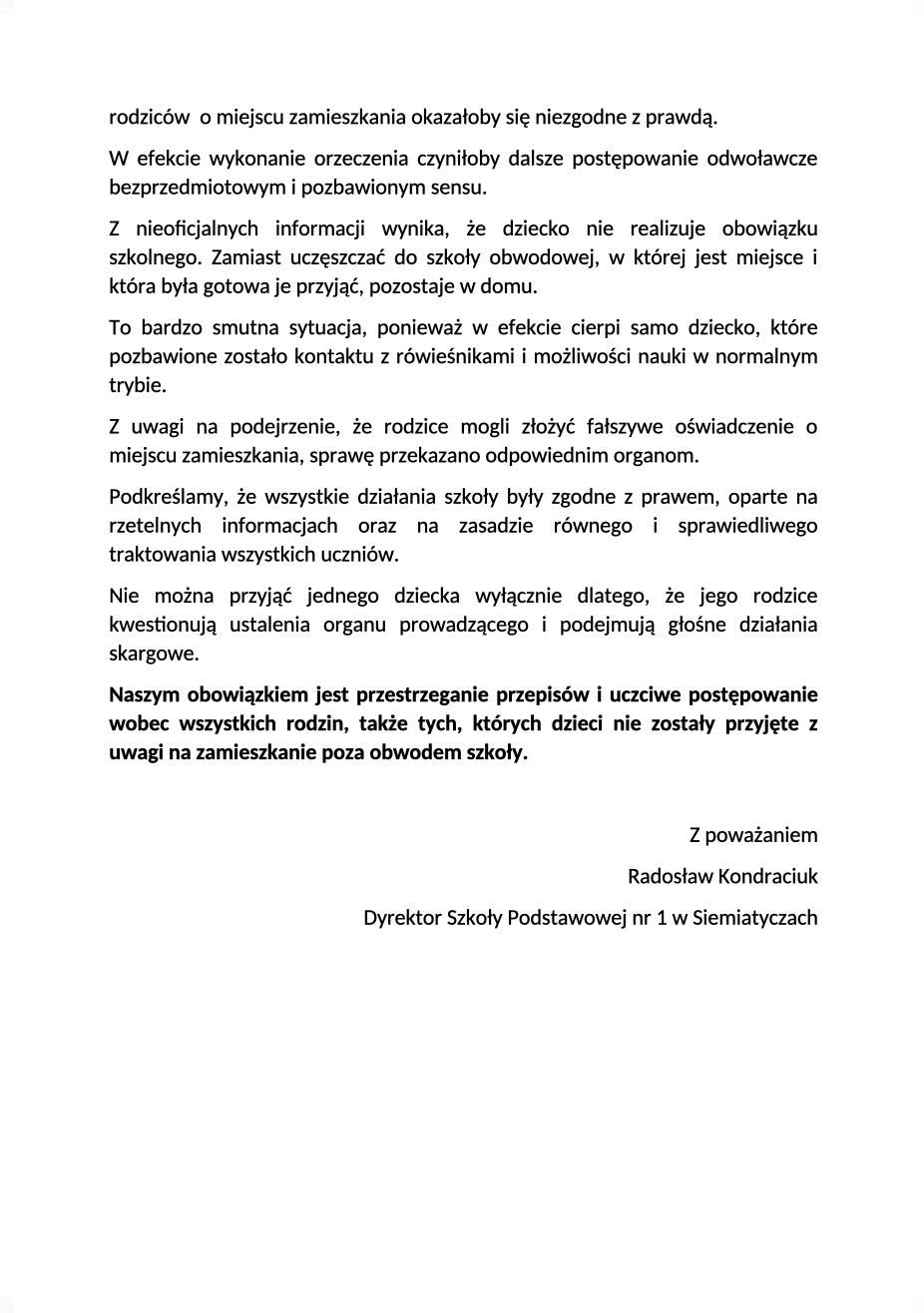 Z kolei dyrektor szkoły, Radosław Kondraciuk, wydał kilka dni temu, już po decyzji WSA oficjalne stanowisko, w którym tłumaczy, że odmowa przyjęcia dziecka była zgodna z przepisami. „Zgodnie z obowiązującym prawem o przyjęciu dziecka do szkoły obwodowej decyduje faktyczne miejsce zamieszkania. W naszym przypadku otrzymaliśmy informacje, że dziecko nie mieszka w obwodzie szkoły” – dodaje.