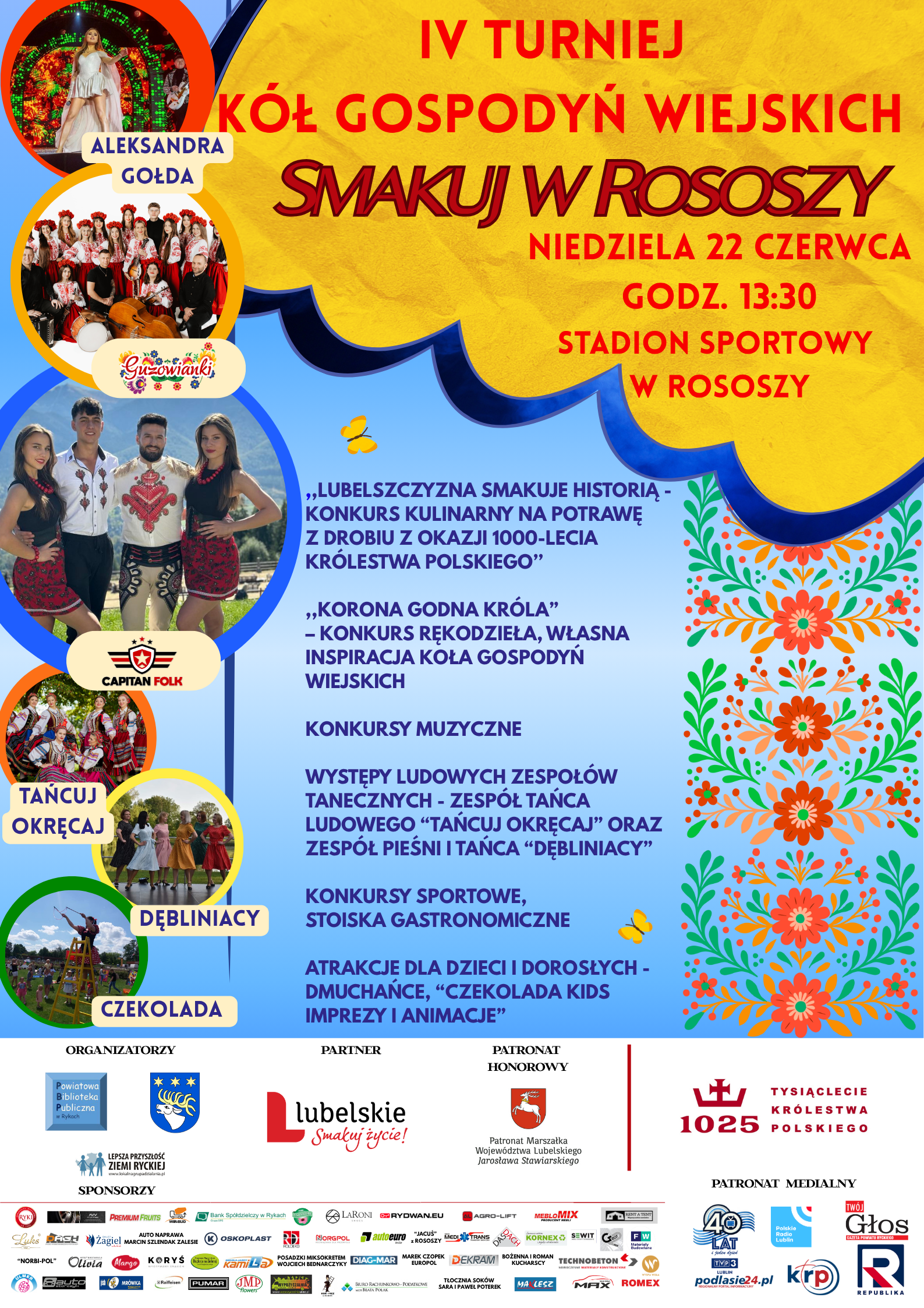 „Smakuj w Rososzy” to coroczna, cykliczna impreza plenerowa, która łączy tradycję, kulturę i smak – prezentując to, co w Lubelszczyźnie najlepsze. Wydarzenie odbywa się pod patronatem Marszałka Województwa Lubelskiego, w ramach partnerstwa z Województwem Lubelskim „Lubelskie. Smakuj Życie!”, a tegoroczna edycja została dodatkowo wzbogacona o wyjątkowy kontekst historyczny – 1000-lecie Królestwa Polskiego oraz 500-lecie Hołdu Pruskiego.W programie nie zabraknie emocji! Zaplanowano dwa wyjątkowe konkursy skierowane do Kół Gospodyń Wiejskich i Stowarzyszeń z Powiatu Ryckiego: